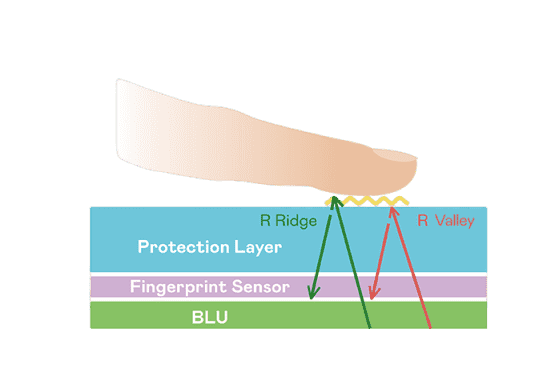TFT 指纹扫描感测技术利用薄膜电晶体 (TFT) 当作光感测元件,,,藉由非晶硅 (a-Si) 与低温多晶硅(LTPS)既有光电转换特性对不同波段光源进行吸收,,使感测 IC 读取阵列感测元件的光漏电差异,,转换成数位灰阶影像。。