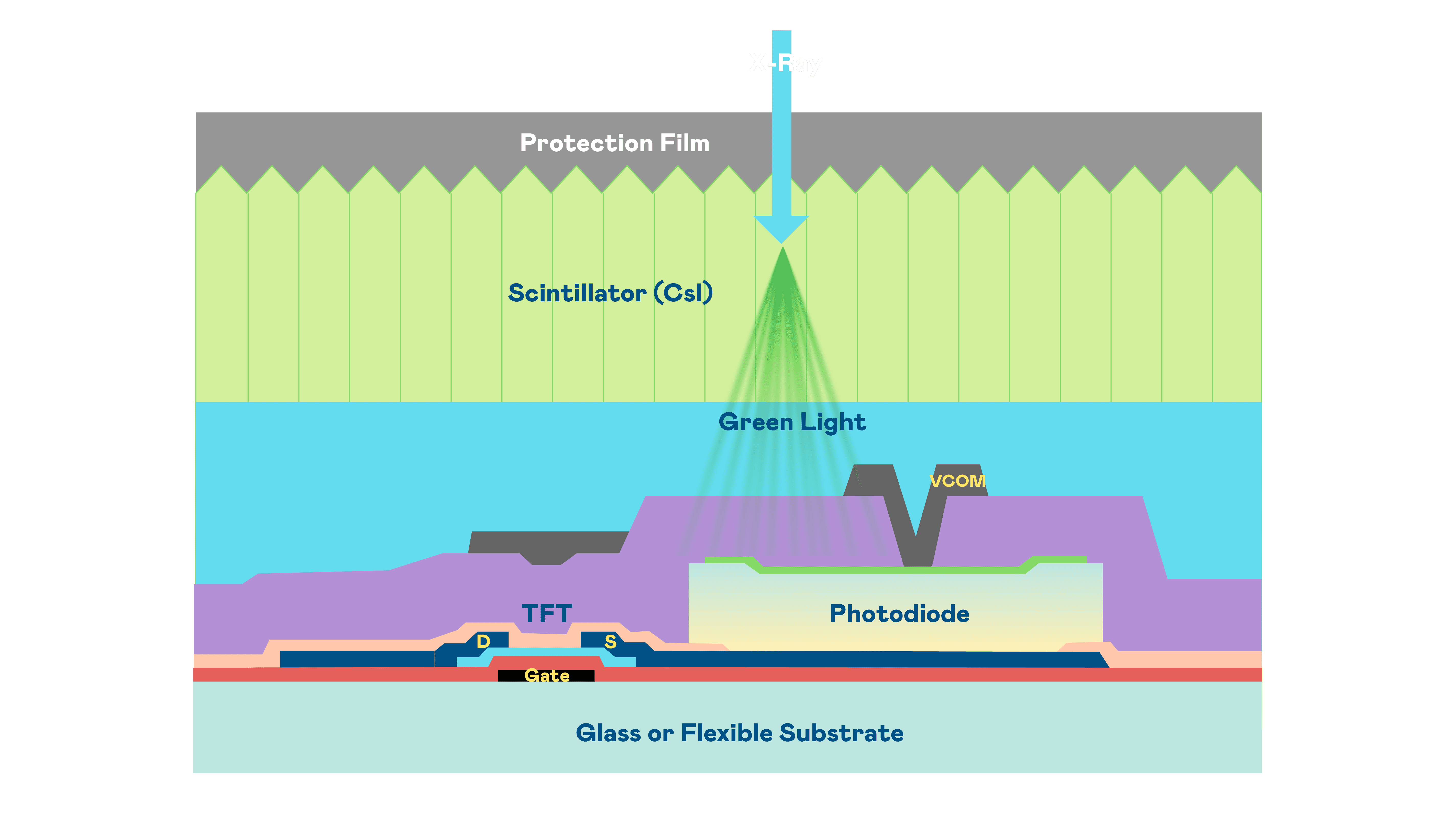 万利的X光影像感测阵列使用薄膜电晶体 (TFT) 作为每个像素的读取开关,,,搭配光电二极体(Photodiode)的光电转换元件,,,,用以感测X光影像讯号。。。